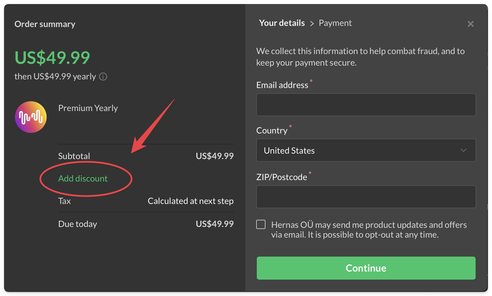 If you have received a discount code, you can apply it while purchasing the app. Go to our Pricing page and choose the license plan that suits your needs. The discount code can be easily added in your billing info. Fill other information and click 'Continue' to complete the purchase.
