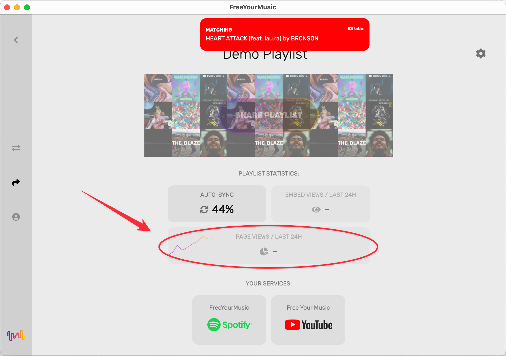You can check insights for each Smart Link you’ve created in our app. Go to the shared playlists, select one of the shared playlists, and find Page Views / Last 24H. Click on it and you will open the statistics page.