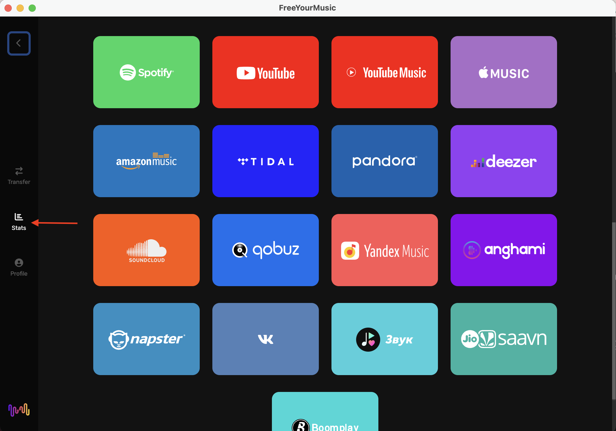 1. First, select "Stats" from the side menu. Then, choose your already connected account for the music streaming service or create a connection to the new one. (see how to connect the new account).
