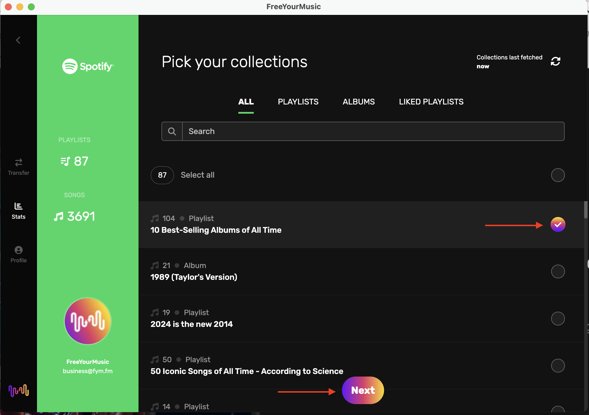 2. Next, select the playlists you want to analyze and click "Next".